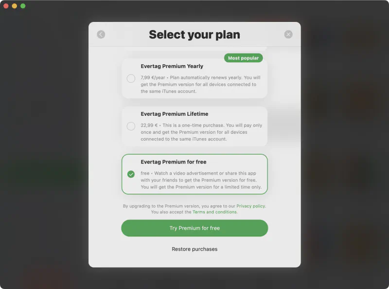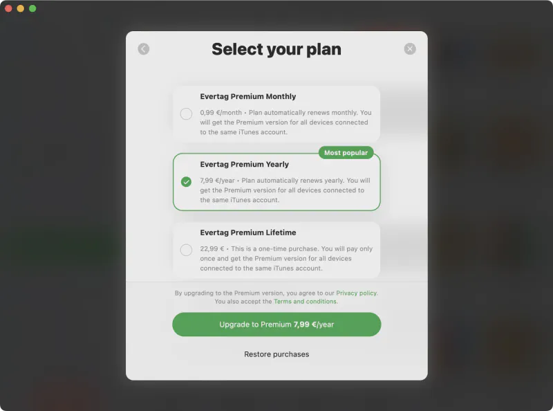 You can also try pressing the “Restore Purchases” button in the app Settings. Afterward, install the latest app version from the App Store on your Mac and start the app. Ensure you have an internet connection and are using the same iCloud and App Store account on your Mac that you used on your iOS device. Wait one minute for the app to download purchase info from iCloud. The Premium version should activate on your Mac automatically.