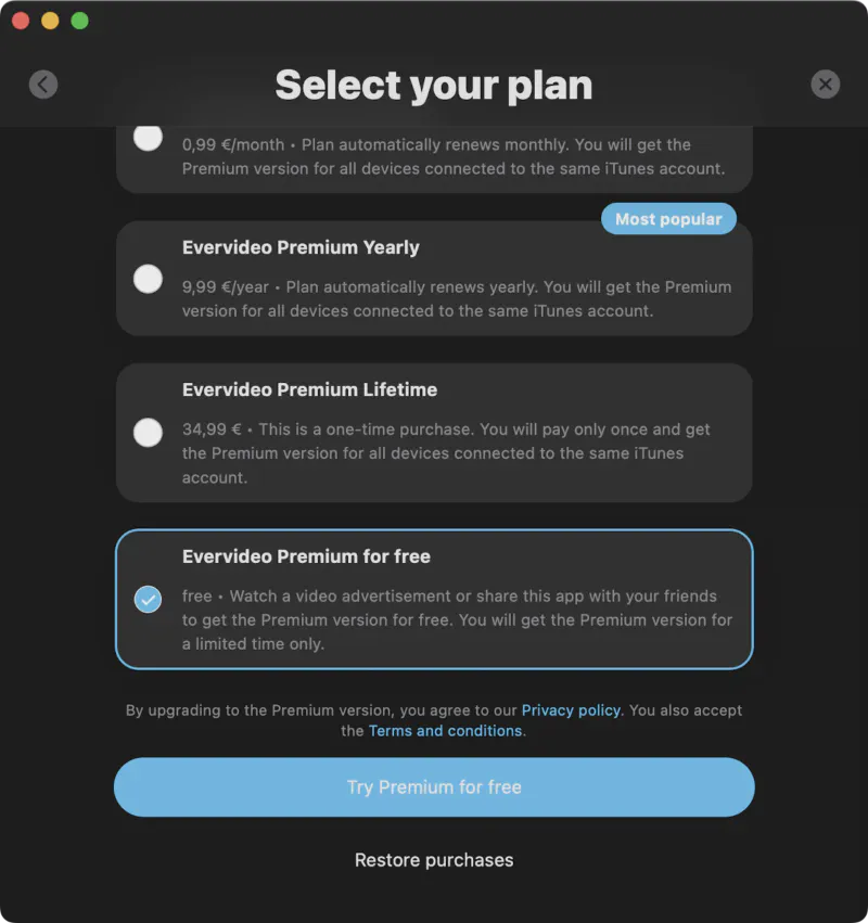 The free version of the application offers a one-time lifetime in-app purchase and two subscription options (1 month and 1 year) to remove all restrictions and upgrade to the Premium version, allowing you to choose the best and most optimal price for you. Prices may vary depending on your country or territory. Also, please keep in mind that Family Sharing is enabled for all purchases and plans, so you can share the Premium version with members of your family.