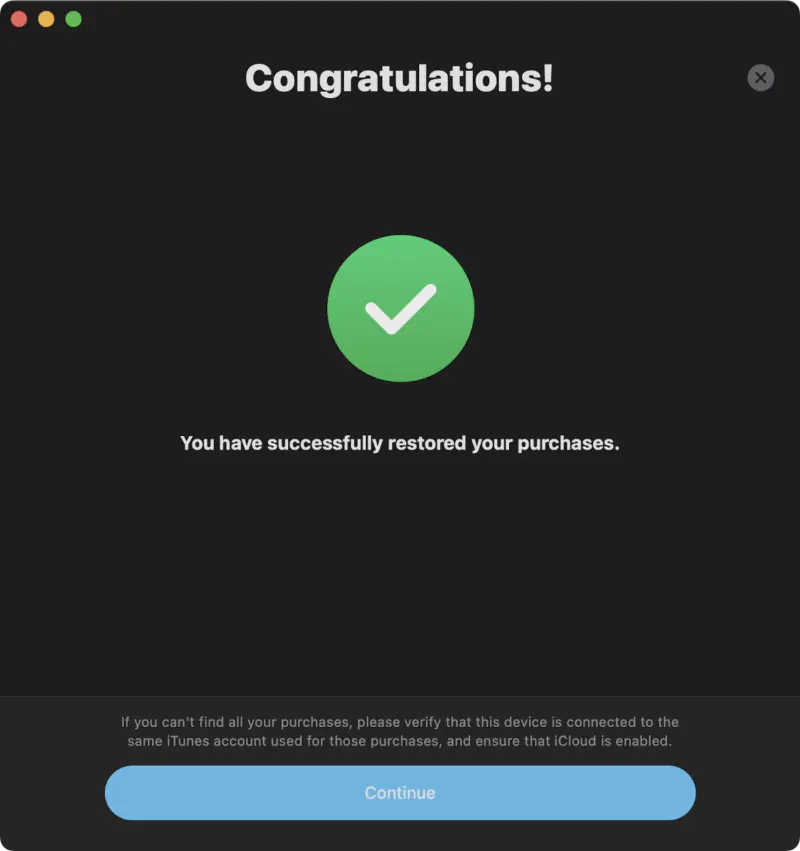 You can also try pressing the “Restore Purchases” button in the app settings. Afterward, install the latest app version from the App Store on your Mac and start the app. Ensure you have an internet connection and are using the same iCloud and App Store account on your Mac that you used on your iOS device. Wait one minute for the app to download purchase info from iCloud. The premium version should activate on your Mac automatically.