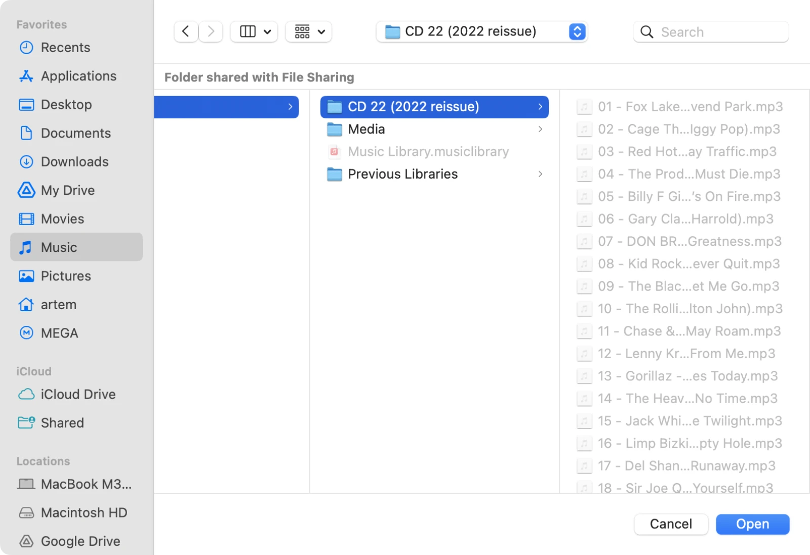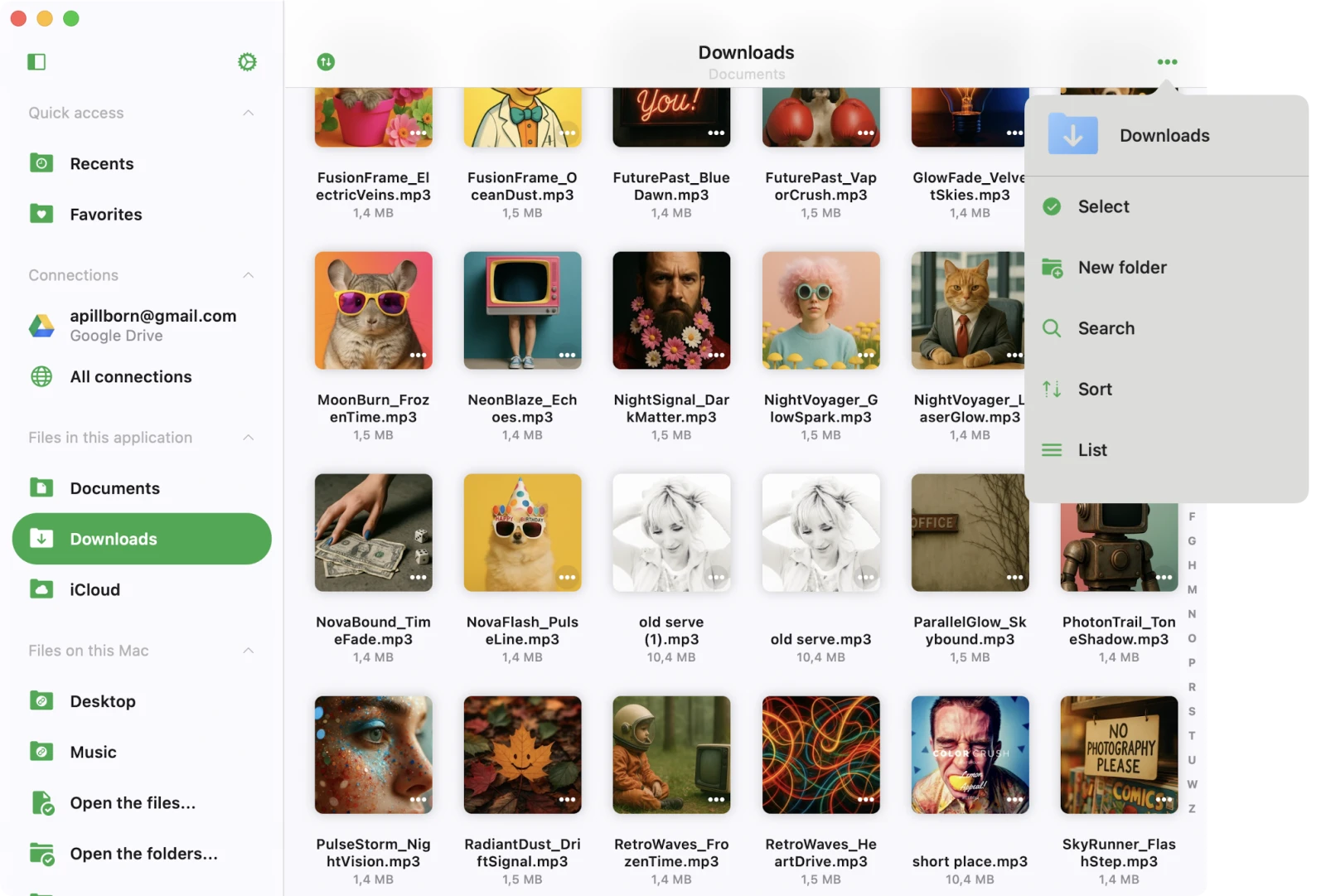 Shows files located on your device but in different applications. You can import them into this application using the system file picker. To activate the picker, choose “Open files…” to select files or “Open folders…” to select folders. Detailed instructions on how to import local music stored on your iPhone or Mac are available here. You can also connect a folder located on your device and have quick access to the folder’s content. Use the “Connect a folder” menu item and choose a folder located on your device. Tap “Done,” and the app will create a link to that folder with read/write access, allowing you to manage files directly from this app. To disconnect a folder located on your device, tap the “More Actions” button and choose “Disconnect.”
