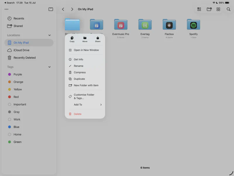 Navigate to your Music folder. Tap and hold it to open the context menu, then choose Copy.