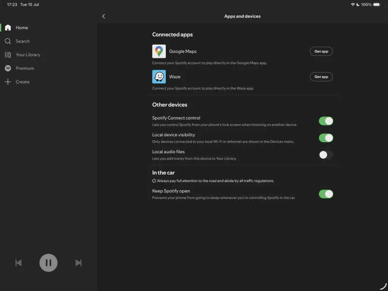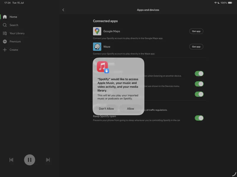 Find and tap the Apps and Devices menu item to view device integration settings.