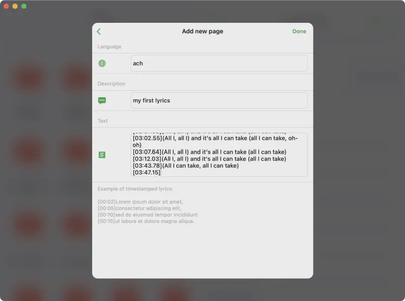 After entering your lyrics, tap Done on the lyrics page. Then tap Done again on the previous screen to confirm your changes.