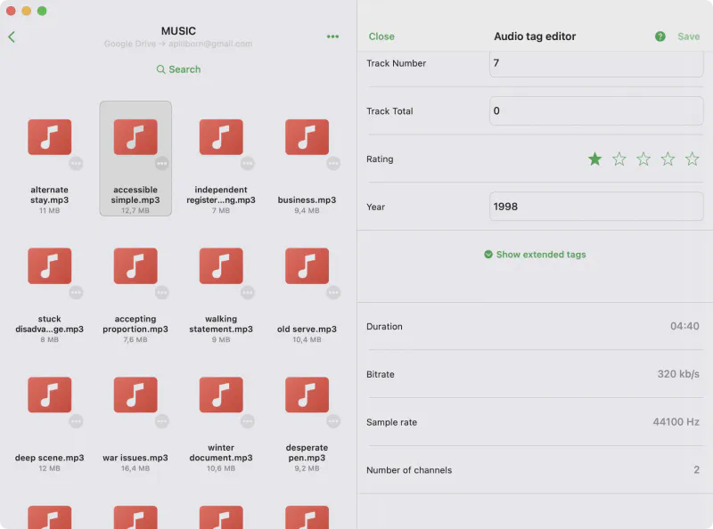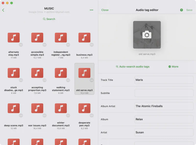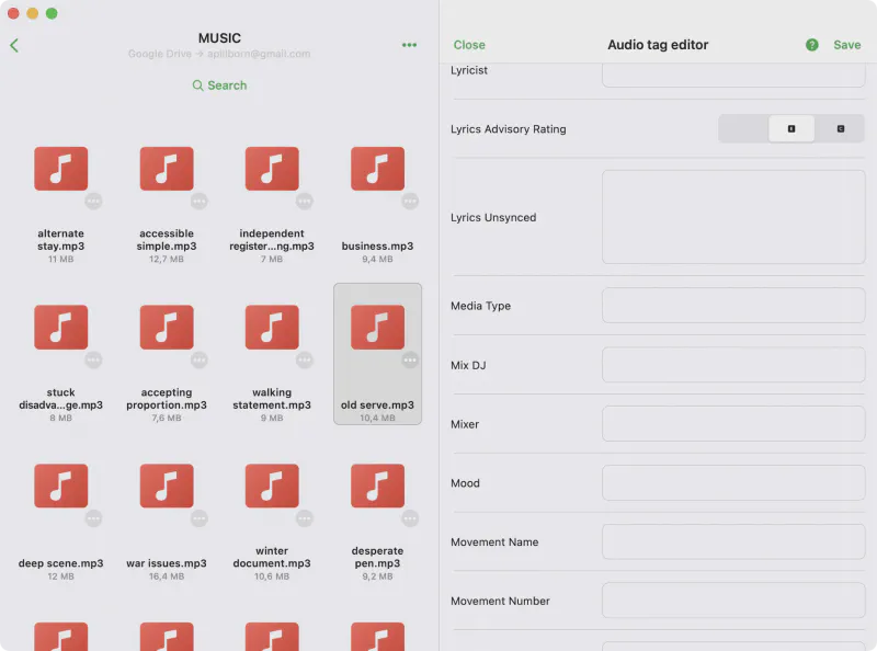 You can edit audio tags for both Local files stored on your device and Cloud files stored in connected cloud accounts. In cloud storage mode, the app will automatically download the file from your cloud service, allow you to edit the tags, and then upload the updated version back to the cloud once editing is complete. You can also choose whether to delete the temporary local copy after editing.