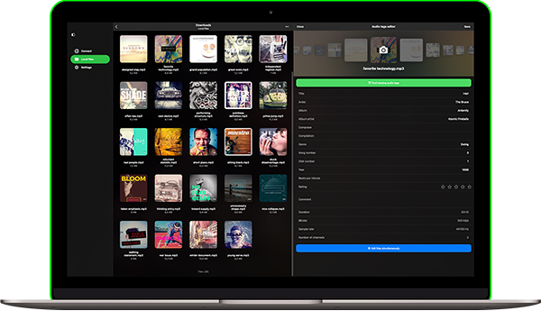 Quickly edit music tags like Title, Artist, Album, Album Artist, BPM, Comment, Composer, Disk Number, Genre, Lyrics, Rating, Track Number, Year, and more.