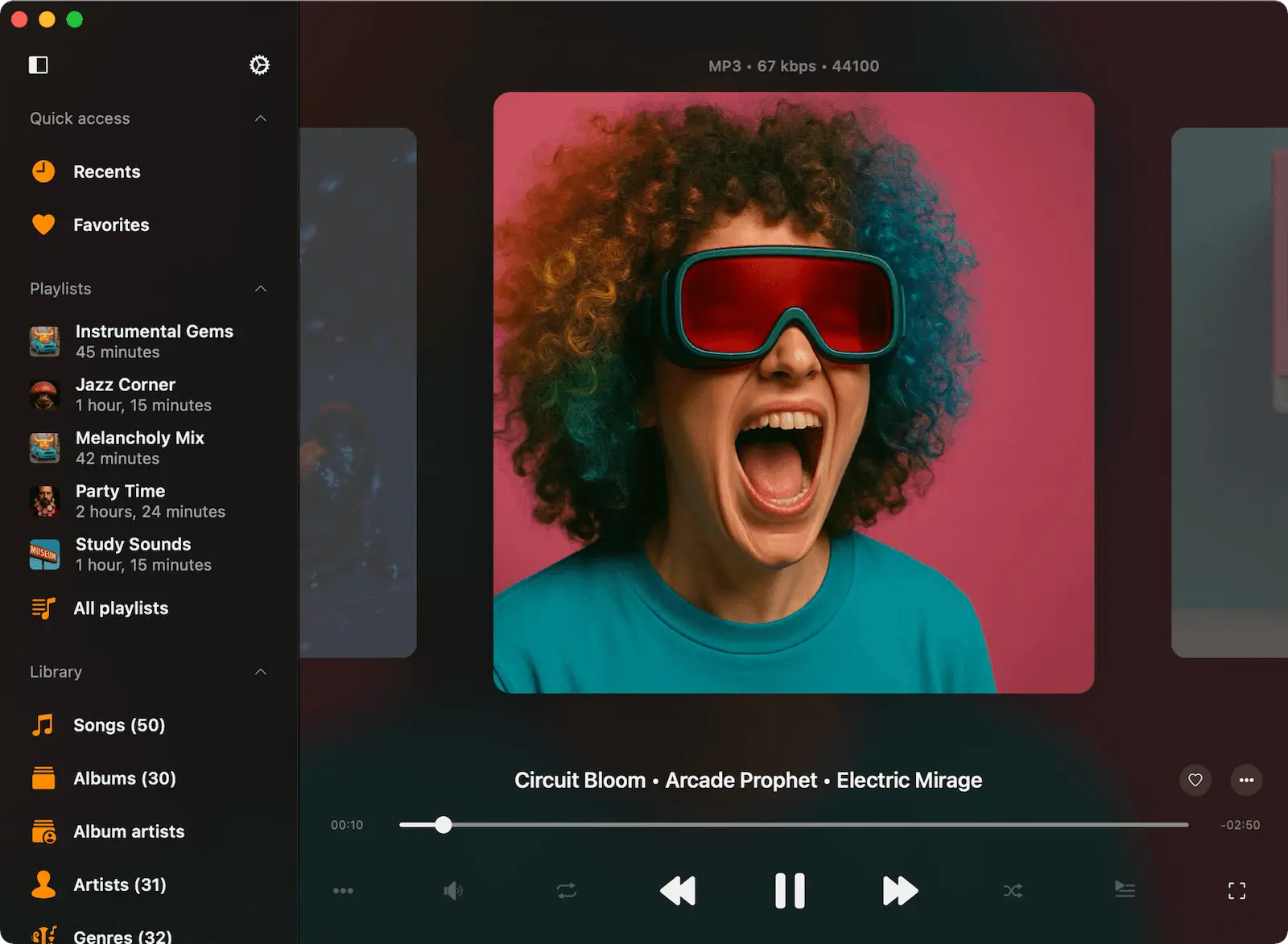 When you add tracks to your library, a background metadata reader scans your files and organizes them by Artist, Album, Genre, and Composer.